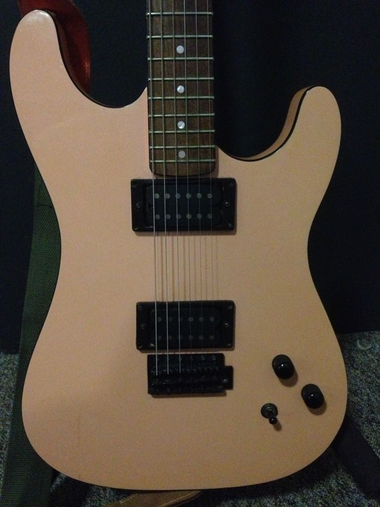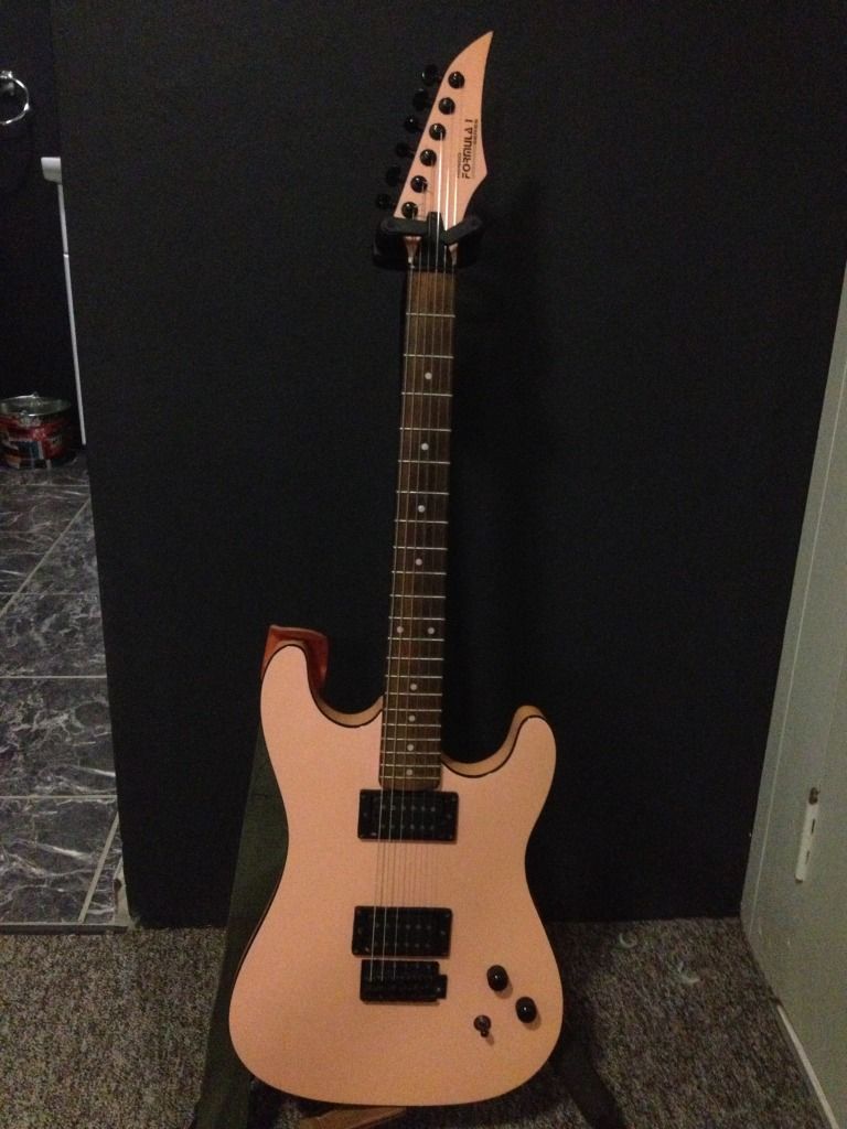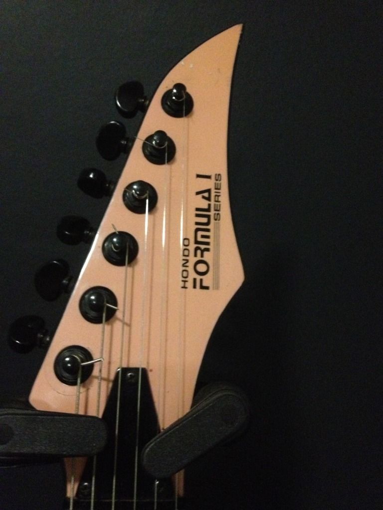 This is actually a new old guitar day for me , I was driving in Pta North and found this shop by accident , but man I am glad that I did . It is a pawn/musical instrument shop , they have some weird guitars and basses but not a single electrical guitar amp so I had no way of testing it . The guitar I walked out with was this pink Hondo Formula One with black hardware , Grover tuners and a brand new case for just over a grand , I worked the rest of the day , wondering how this guitar would sound plugged in and boy was I surprised , this guitar sounds huge , everything on it feels like great quality , and it stays is tune very well . My future plans for this guitar is to put in some GFS Power Rails and a Wilkinson floating trem . Here she is , my guitar that is the same colour as a strawberry Steri Stumpie . If any of you guys have some more info on the brand Hondo it would be much appreciated