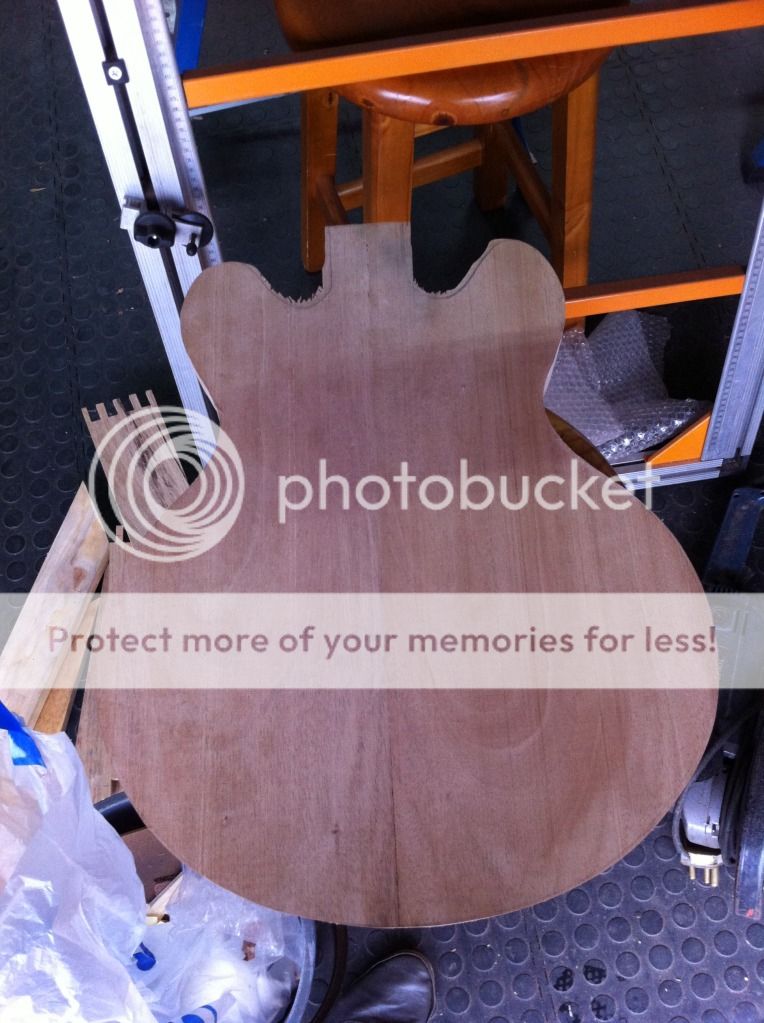 Anyway here's the story so far.... I started with the 335, cut and shaped the mahogany by hand because my router couldn't manage the hardness of the wood... and still waiting on some birdseye maple for the top and bottom