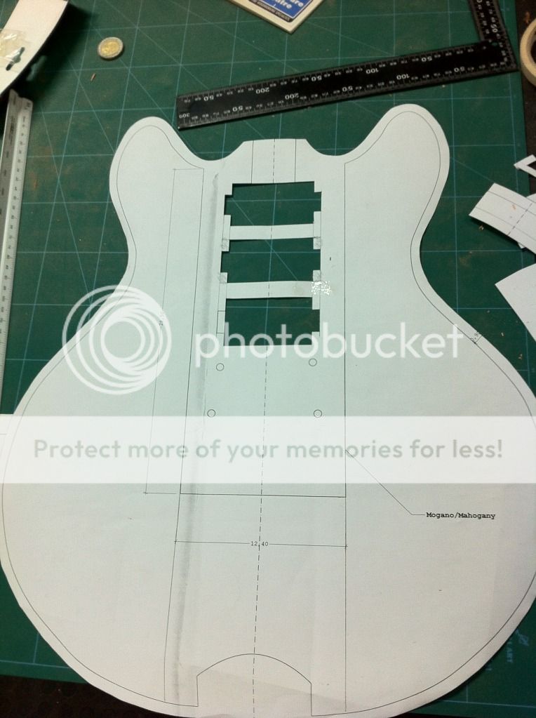 The paper template to be transferred to a wooden one (Yes the three pickups are happening! ? '57 classic neck, P94 middle and Burstbucker 3 bridge ? )