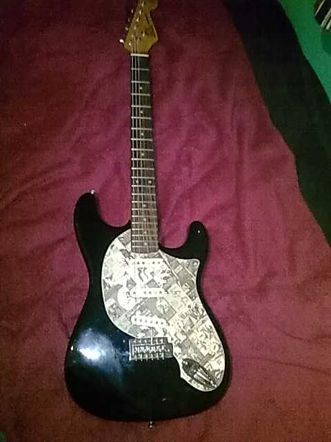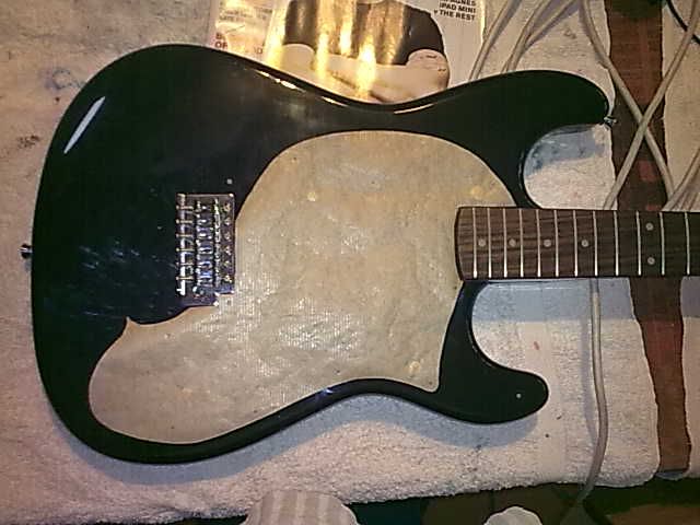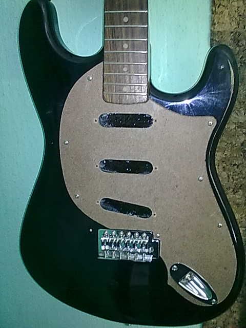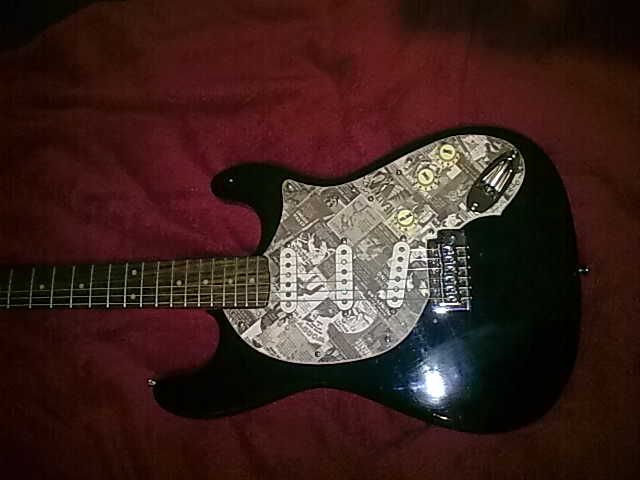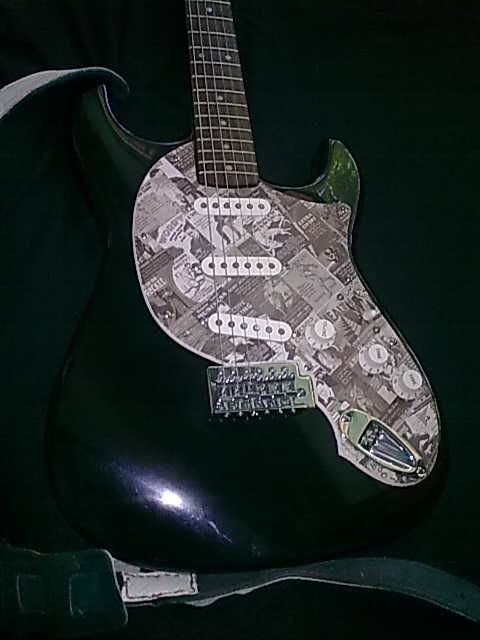 I had a really great looking telecaster scratch plate in mind and used that idea and adapted it for my strat. I started with a basic idea made out of paper. The idea doesn't cover two of the holes that are already there, so I will have to fill those in later, but that will happen when the time comes!!!