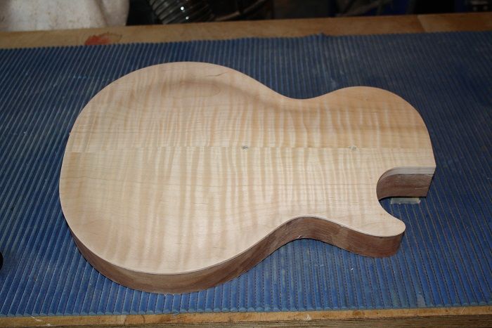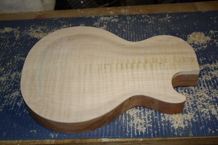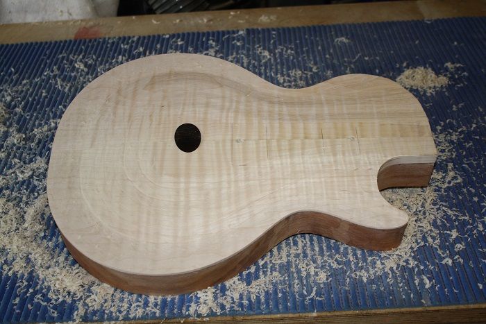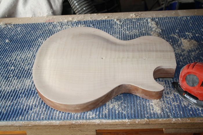 Anyway I've "finished" the first carve. It still needs the neck plane to be done, but I couldn't resist working down to an 800 grit to bring out grain. I started with an oval scraper from StewMac - amazing little tool and I worked it out very quickly: