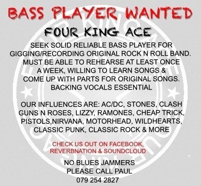 Old school rock band FOUR KING ACE are looking for a bass player. We are a gigging and recording band. Must be able to rehearse at least once a week. Willing to learn & come up with parts for original songs, Backing vocals essential. NO TIME WASTERS please. If you cannot commit, please don't reply. We are into AC/DC. Lizzy, Stones The Clash, GnR, Ramones, Cheap Trick, Pistols, Nirvana, Motorhead, Wildhearts, classic punk, classic rock and more. NO BLUES JAMMERS. Call or whatsapp Paul 0792542827