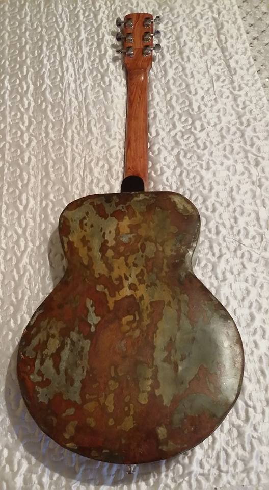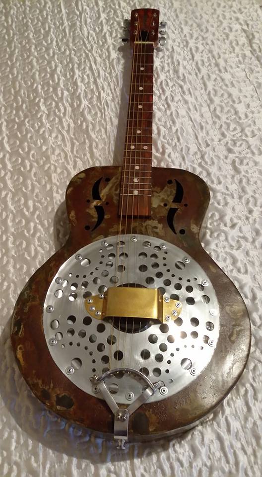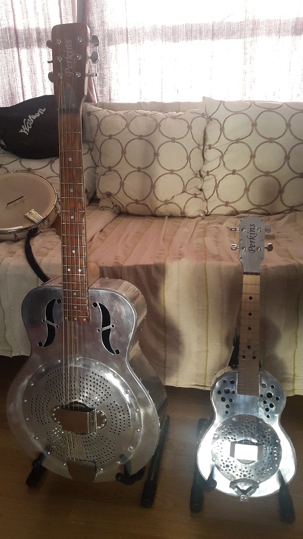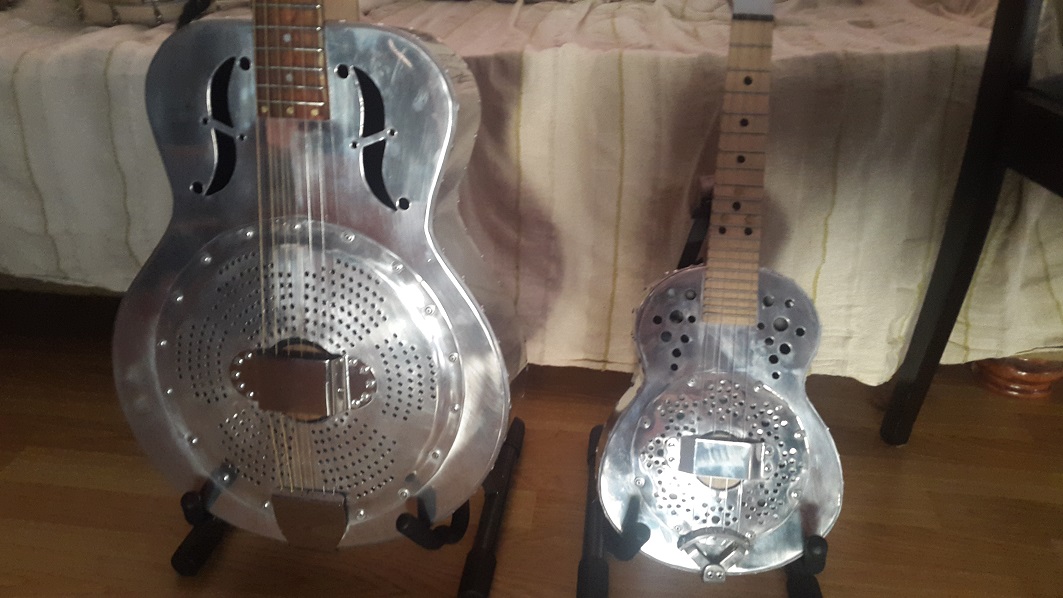 A full size handmade Resophonic guitar, and a Ukulele version for my grandson