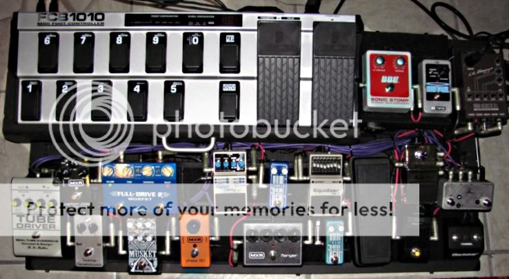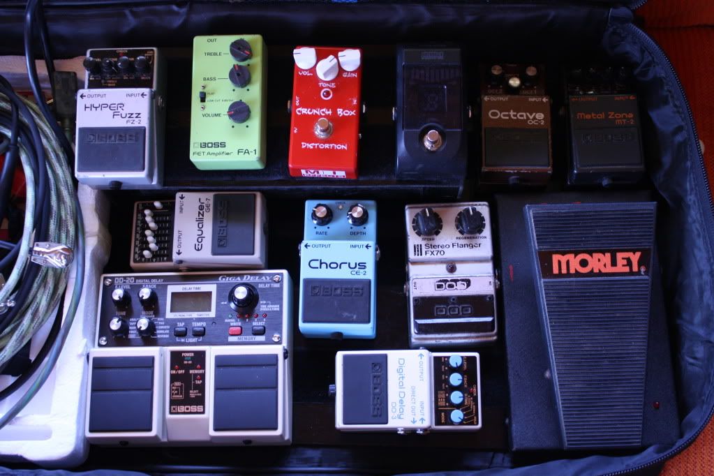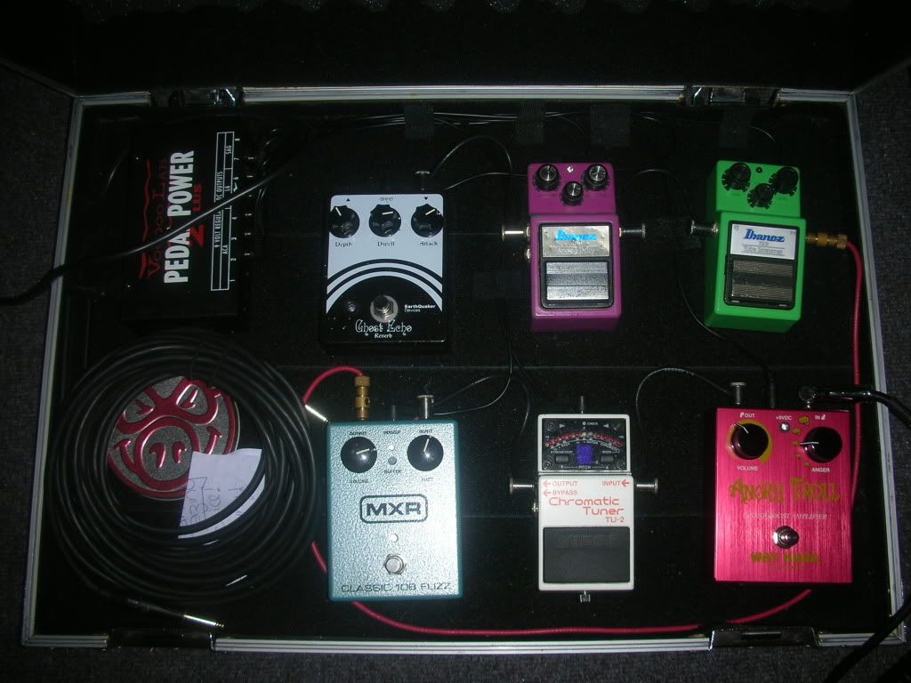 First, it's a dual voltage system, 220V and 110V AC. Power comes from two rack model power conditioners, a 220V and 110V unit (EBay bargain at $40 USD for the 110V one 8)) I currently run all the pedals - except the BK Butler Tube Driver which uses 220V direct - off a Cioks DC-10 and a BBE Supacharger, both which runs off 110V. All the plugs and power units are hidden below the FCB1010 (can lift up, it's bolted to the lid), the FCB1010 also runs of 110V.